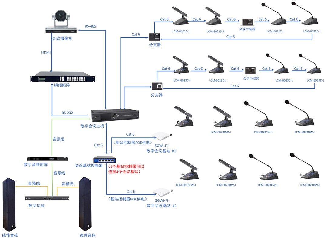 支持通過“AC 控制器 + 多 AP”模式進行無線網絡覆蓋,提高無線會議單元的接入容量,覆蓋更大的應用范圍。