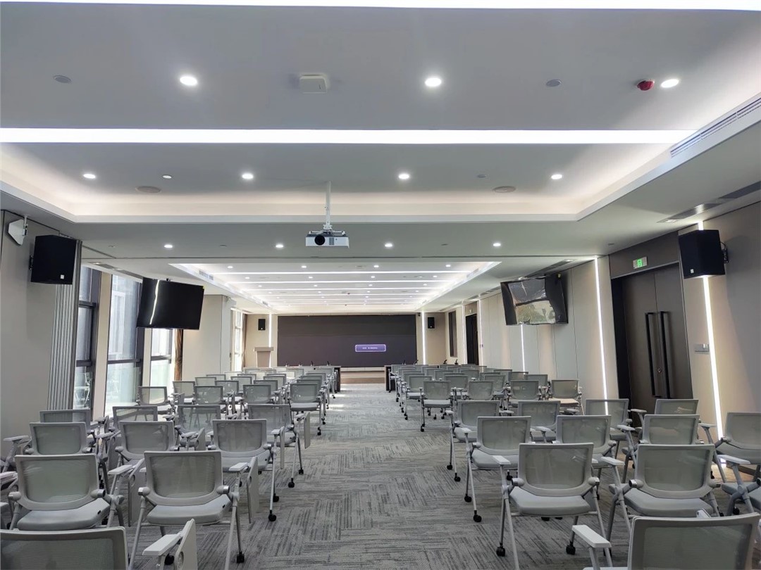 (培訓(xùn)室的舞臺主擴(kuò)聲音箱搭配側(cè)邊補(bǔ)聲音箱)