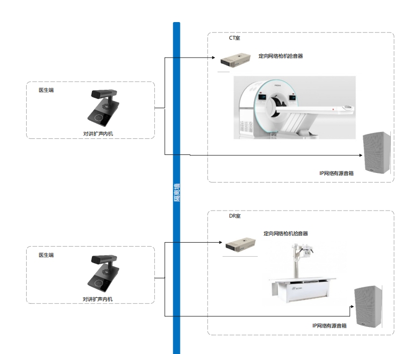 核磁醫檢對講擴聲系統可在高噪聲環境下使用,具備全雙工對講、主動降噪等功能,在核磁醫檢場景下,可滿足醫生和患者之間的正常通話交流需求。目前在國內多家醫院的放射科室(CT室、DR室)有應用。