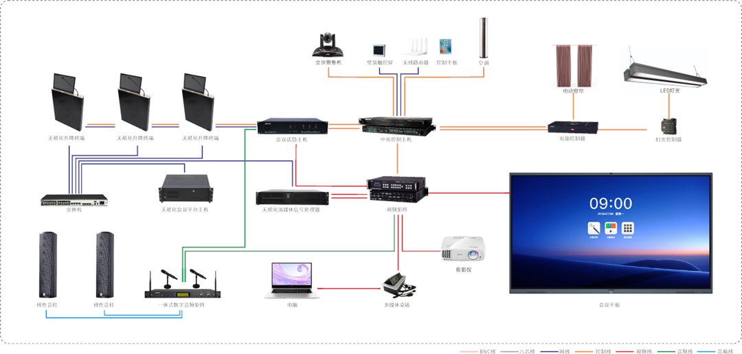 中控矩陣系統為智能多媒體會議室系統設計靈魂,集中了燈光、機械、投影及視音頻控制手段于一體,為使用者提供簡單、直接的控制界面,令使用者能方便地掌握整個空間環境各設備的狀態及功能。中控系統采用平板電腦進行操作,根據會議室的時間使用情況,編輯運行控制程序,下載到中控主機和平板電腦進行控制運行,達到音視頻切換實時操控,解決繁瑣操作。