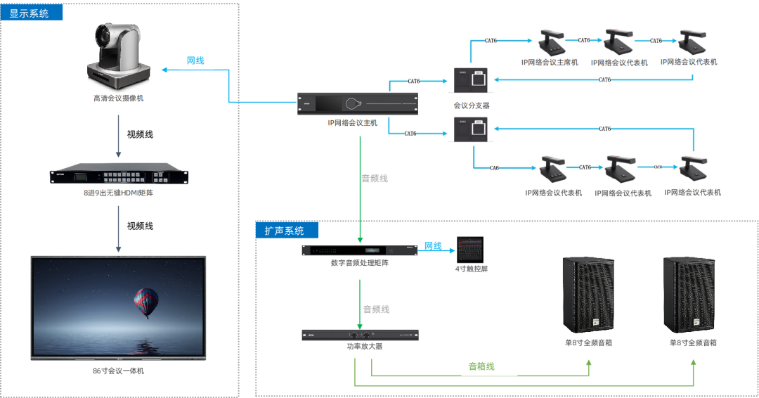 通過有線+無線使用搭配,確保領導席位使用有線會議發言單元發言穩定可靠,無線話筒作為活動主持或者流動使用。