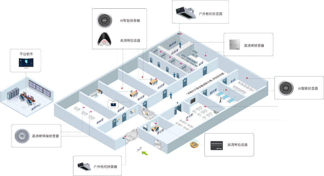 關于拾音器的設計部署指揮中心:在指揮中心部署后臺管理軟件,可以對接入的拾音設備進行狀態監視、故障報警、軟件升級和相關性能參數調整,便于隨時掌握拾音設備運行狀態。監室/禁閉室/等候室:監室、禁閉室、監獄醫院、室內公共區域等場景,建議在此多點位部署拾音器,確保做到全天時無死角監聽。在側墻處、天花板處安裝具備防破壞性、隱蔽性高、抗混響設備。審訊室/談話室/會見室:在審訊室、談話室、會見室等近距離桌面拾音環境,推薦在桌面部署桌面型拾音器可以有效拾取雙方近距離音源屏蔽其它音源干擾,聲音更清晰;再部署一個環境型拾音器對全室聲音進行拾取。拾音器通過與攝像頭聯動,同步錄音錄像,確保審訊/談話/會見時的錄像錄音備份公正。周界/武警崗亭/AB門/放風場:室外區域具有環境噪聲大、人員聚集多、晝夜溫差大、環境惡劣等特點,對于此處需要高清拾音,但傳統拾音器普遍效果較差無法達到理想效果。通過部署槍擊型拾音器對室外周邊區域位置進行聲音監控。降低后期維護成本,提高工作效率。有效預防突發事件,做到事前預防、事中控制有效、事后處理規范。
