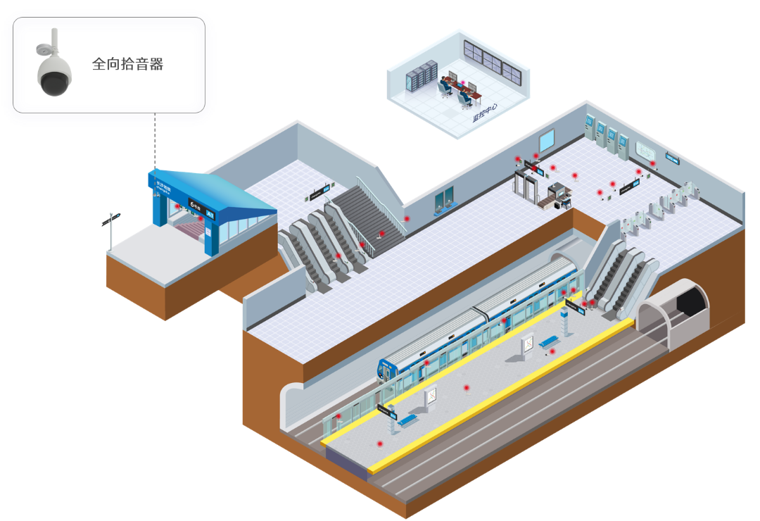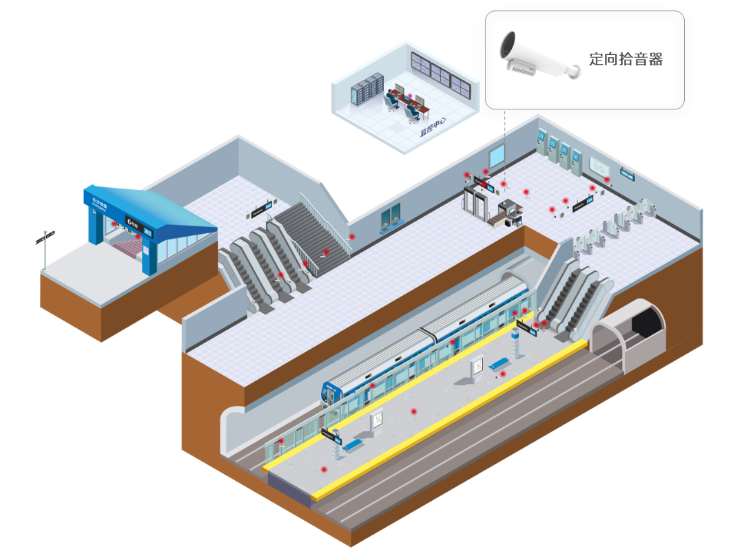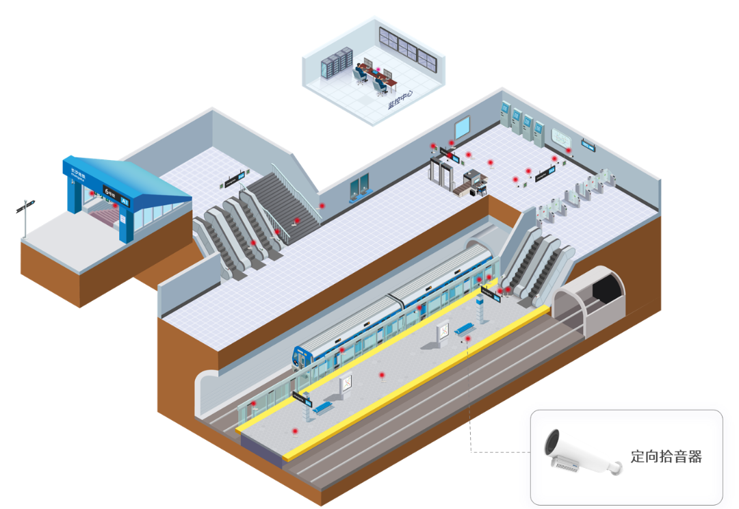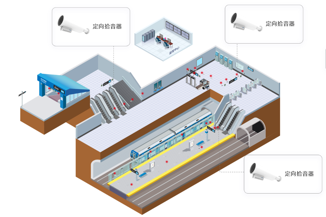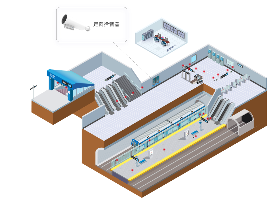 部署方案:通過部署定向型拾音器對主要通道進行聲音監控,為事件發生原因、聚集討論目的、司乘人員糾紛提供依據降低后期維護成本,提高工作效率。有效預防突發事件,做到事前預防、事中控制有效、事后處理規范。