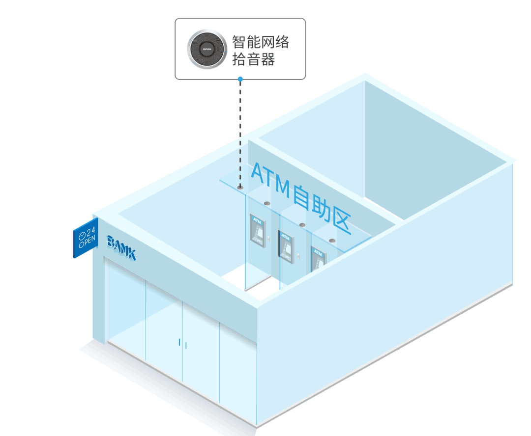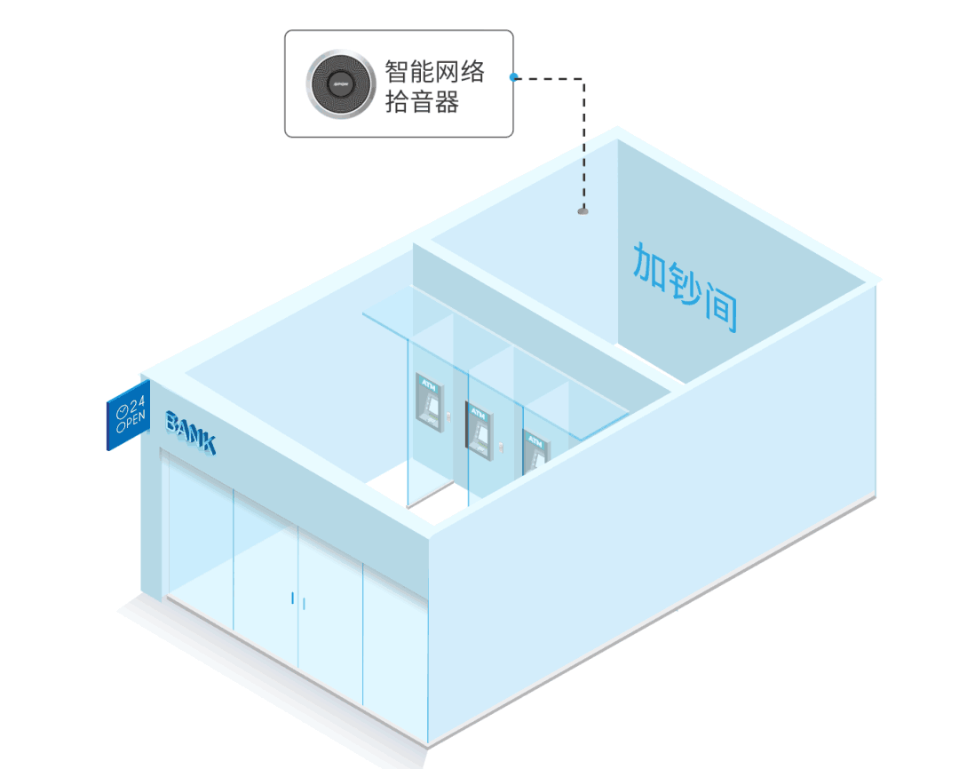 部署方案:在加鈔間吸頂安裝一個智能拾音器,精準拾取前端聲音,支持“打、砸、撬、挖、鋸”等異常聲進行音頻分析,實現主動預警功能。