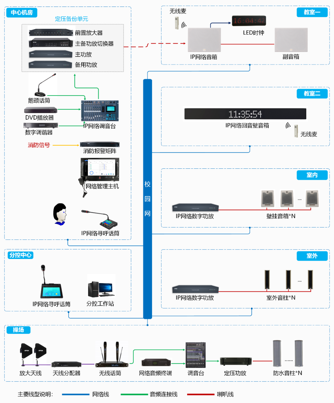? 遠程尋呼:滿足遠程講話,校長在辦公室即可對任意班級或室外區域喊話;